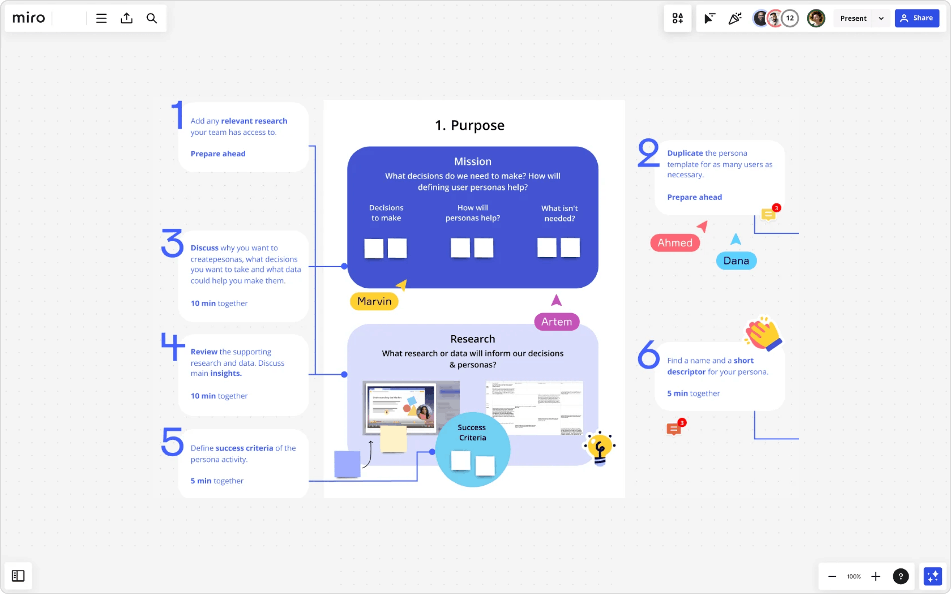 Zusätzlich zum Kundenfeedback sollten Personas erstellt werden, eine fiktive Darstellung typischer Kunden. Sie dienen dazu, den Kunden und seine Bedürfnisse, Herausforderungen und Ziele besser zu verstehen. Eine Persona beleuchtet neben demografischen Merkmalen auch berufliche und persönliche Aspekte, wie zum Beispiel typische Charaktereigenschaften, Wünsche oder Erwartungen. Eine gut entwickelte Persona hilft, die Bedürfnisse und Wünsche der Zielgruppe besser zu verstehen. Im folgenden Artikel finden Sie Templates und Vorlagen von Miro: User Persona Template